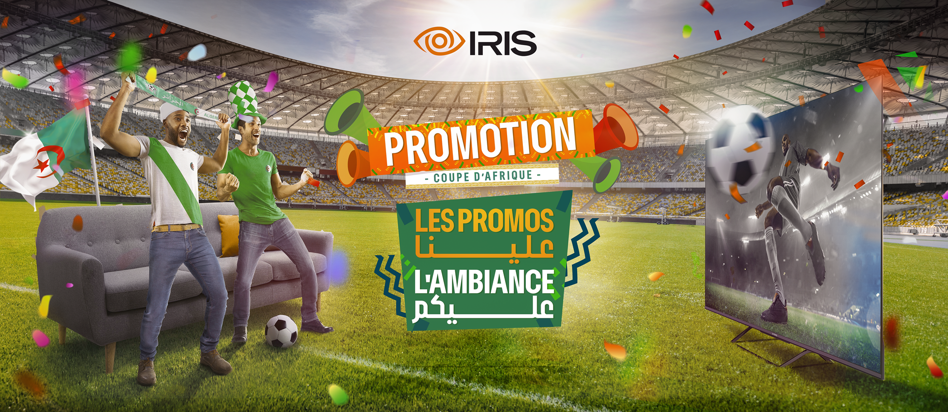 The tagline “Les promos علينا، l’ambiance عليكم” perfectly captures this exchange: IRIS delivers the technology and promotions, while the fans bring the passion.